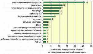 Так, на основе укрупненного анализа отраслевой структуры 100 крупнейших компаний-инвесторов Казахстана по объемам продаж видно, что на нефтегазовую промышленность (горнодобывающая отрасль) приходится наибольшее количество крупных предприятий-инвесторов (рисунок 1). В отраслях топливно-энергетического и минерально-сырьевого комплексов инвестиционная активность значительно выше, чем в большинстве предприятий реального сектора экономики, производящих продукцию конечного потребления.