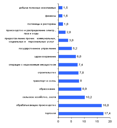 В структуре занятости в 2007г. наибольшее количество занятых отмечалось в оптовой и розничной торговле, обрабатывающих производствах, сельском хозяйстве. Наименьшее - в добывающей промышленности и финансах.