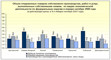 В январе-октябре 2008 года по сравнению с январем-октябрем 2007 года рост основных социально-экономических показателей был отмечен в большинстве субъектов Российской Федерации. Объем отгруженных товаров собственного производства, выполненных работ и услуг собственными силами добывающих и обрабатывающих производств, производства и распределения электроэнергии, газа и воды (с учетом оценки объемов производства малых предприятий) превысил уровень января-октября 2007 года в большинстве субъектов Российской Федерации и во всех федеральных округах Российской Федерации. Среди федеральных округов Российской Федерации наиболее высокий индекс промышленного производства, исчисленный по видам деятельности "Добыча полезных ископаемых", "Обрабатывающие производства" и "Производство и распределение электроэнергии, газа и воды", в январе-октябре 2008 года по сравнению с январем-октябрем 2007 года отмечен в Центральном федеральном округе (108,7%). (Приложение 4)