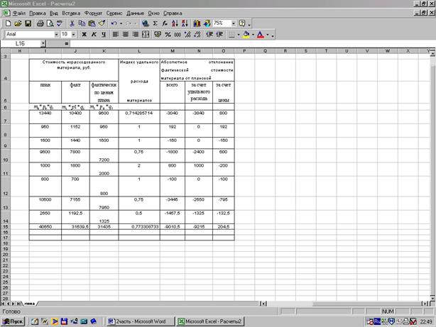 В целом достигнуто увеличение удельных расходов материалов по сравнению с запланированными расходами на 7% (общий индекс удельных расходов =1,07). Экономия материалов на выполненный объем работ в результате изменения удельного расхода составил 2710руб.