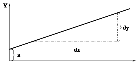 Построение линейной регрессии сводится к оценке ее параметров – а и b. Оценки параметров линейной регрессии могут быть найдены разными методами. Можно обратится к полю корреляции и, выбрав на графике две точки, провести через них прямую линию. Далее по графику можно определить значения параметров. Параметр a определим как точку пересечения линии регрессии с осью OY, а параметр b оценим, исходя из угла наклона линии регрессии, как dy/dx, где dy – приращение результата y, а dx – приращение фактора x, т.е. Ŷ = а + bx.