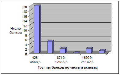 r = (22,4 – (6–2–1))/Ö(2*(6–2–1))= 7,9>3, следовательно, что гипотеза о соответствии распределения банков по размеру чистых активов закону нормального распределения отвергается