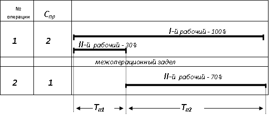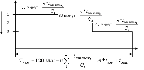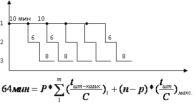 Тц — общая продолжительность процесса, включающая простои или пролеживание предмета труда между рабочими местами, на рабочих местах и т. п.