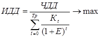 Итак, оценка эффективности ИП с позиций инвестора производится в основном на базе дисконтированных показателей. Условием отбора ИП к инвестированию является максимизация значений ЧДД, ИДД и ВНД при среднем значении ставки дисконта (Е) на рынке капитала.