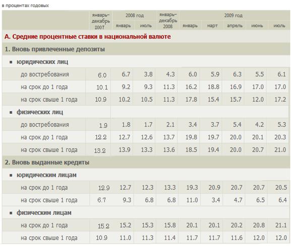 Ставка рефинансирования и ставки межбанковского рынка оказывали влияние на формирование процентных ставок по кредитам и депозитам в национальной валюте. В январе – декабре 2008 г. средняя процентная ставка по новым рублевым кредитам банков составляла 13,6 процента годовых, что на 0,4 процентного пункта ниже, чем в январе – декабре 2007 г. (Приложение 3); по новым срочным рублевым депозитам юридических и физических лиц – 9,5 процента годовых, что на 2,2 процентного пункта ниже, чем в аналогичном периоде 2007 года.