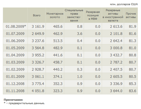 Существенную роль в обеспечении стабильности национальной валюты сыграет увеличение государственных золотовалютных резервов, которое ожидалось в январе 2009 г. за счет поступления первой части кредита Международного валютного фонда в размере более 800 млн. долларов США. Общий объем этого кредита составляет 2,5 млрд. долларов США.