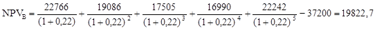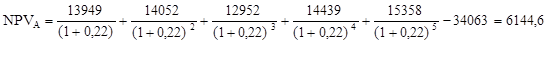 Таким чином період окупності для проекту А становить 2 роки 171 днів, а для проекту В – 1 рік і 276 днів, що підтверджує більшу інвестиційну привабливість проекту В.