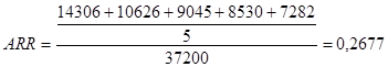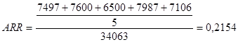 Метод визначення середньої норми прибутку на інвестиції (АRR) зводиться до розрахунку показника, який базується на використанні бухгалтерського показника – прибутку. Визначається він як відношення середньої величини прибутку, одержаного з бухгалтерської звітності, до середньої величини інвестицій. При цьому розрахунок може здійснюватися на основі прибутку (доходу) без урахування виплати податків та відсотків за кредит. Останній метод використовується частіше, бо краще характеризує ту вигоду, яку одержать власники підприємства та інвестори. Цей метод не передбачає використання грошового потоку та не враховує вартості грошей у часі, що значно знижує цінність результативного показника, який розраховується за формулою: