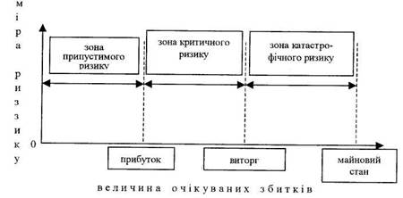 Область, у якій величина ймовірних утрат змінюється від нуля до значення розрахункового прибутку, називається зоною припустимого ризику. Ризик у цьому варіанті вимірюється ймовірністю