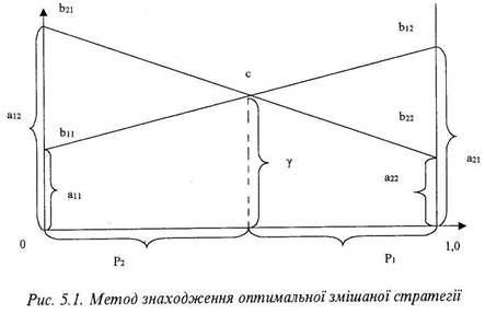 Розв'язати гру — означає знайти ціну гри й оптимальні стратегії гравців. Розгляд методів знаходження оптимальних змішаних стратегій для матричних ігор почнемо з найпростішої гри, описуваної матрицею 2 • 2. Ігри із сідловою точкою спеціально не розглядатимуться. Якщо отримана сідлова точка, то це значить, що є невигідні стратегії, від яких слід відмовлятися. У разі відсутності сідлової точки можна одержати дві оптимальні змішані стратегії.Знаючи платіжну матрицю А, задачу можна розв'язати графічно. При цьому методі алгоритм розв'язання дуже простий (рис. 5.1) і полягає в такому: 1) По осі абсцис відкладається відрізок одиничної довжини.