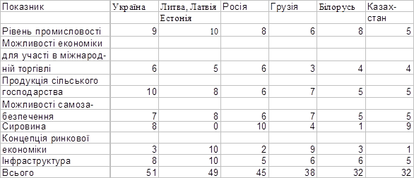 Рівень розвитку економіки України та інших держав колишнього СРСР, балів [4,361]