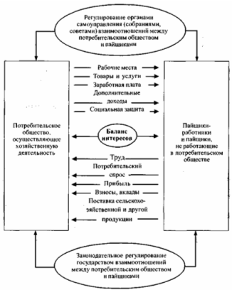 Взаимоотношения, обеспечивающие баланс экономических интересов между пайщиками и их потребительскими обществами, регулируются законодательством и органами самоуправления потребительских обществ.