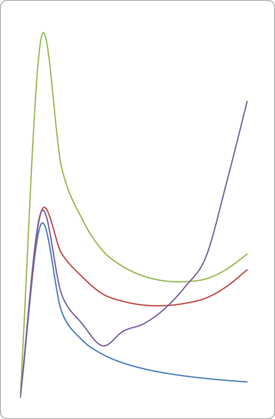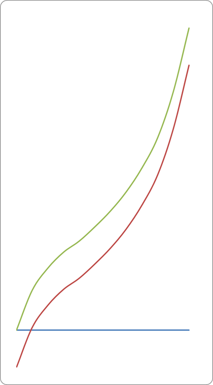 Тут також розглядається короткостроковий період, тому витрати капіталу залишаються незмінними. Змінні та валові витрати зростають. Середні змінні, середні валові та граничні витрати спадають, досягають свого мінімуму, а потім починають зростати через дію закону спадної віддачі. Середні постійні витрати спадають зі збільшенням кількості виготовленої продукції.