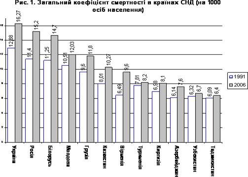 Сукупне населення країн СНД зростало до 1994 року, проте з 1995 року почало скорочуватися, й у 2004 році зменшилось до рівня 1989 р. У 2007 році його чисельність оцінюється на рівні 279,7 млн. осіб, що майже дорівнює показнику 2006 року. Для всіх країн СНД характерним є зростання коефіцієнту смертності населення (рисунок 1), причому Україна за цим показником посідає перше місце. Як наслідок, Україна останнім часом лідирувала серед країн СНД за темпами скорочення населення.