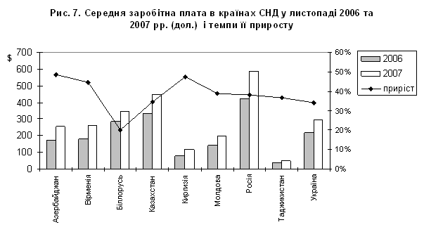 Темпи зростання середньої заробітної плати у 2007 рр. (листопад до листопаду попереднього року та її рівні у 2006 та 2007 рр. (листопад) в доларах за курсом, встановленим національними банками країн Співдружності) наведена на рисунку 2. Згідно з офіційними даними, максимальний приріст заробітної плати був зафіксований в Азербайджані та Киргизії, найменший – в Україні та Білорусі. Максимальний рівень заробітної плати відзначався в Росії та Казахстані, мінімальний – в Таджикистані й Киргизії. Розрив між рівнями заробітної плати серед країн Співдружності зріс до 12,3 разу проти 12,1 разу в 2006 році.