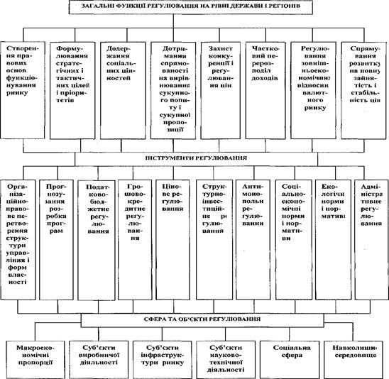 Ефективний розвиток кожної економічної системи вимагає постійного пошуку оптимальних варіантів сполучення державних і ринкових складових та інтересів. Схема державного регулювання на рівні суб'єктів господарської діяльності, яка включає в себе його загальні функції, засоби, сферу та об'єкти і в основному прийнятна для діяльності моделі ринкової економіки на макрорівні, надається на рисунку 3.