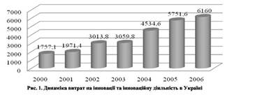 Позитивною тенденцією є те, що витрати на інновації та інноваційну діяльність в Україні постійно зростають (рис. 1) ) [11, с. 90]. Протягом 2000 - 2006 років вони збільшилися з 1757,1 млн грн до 6160 млн грн, тобто у 3,5 рази. Проте, слід відмітити, що динаміка зростання цих витрат не є постійною. Так, у 2001 році порівняно із попереднім сума коштів збільшилася на 12,45%, у 2002 р. - на 52,48%, у 2003 р. - на 1,37%, у 2004 р. - на 48,19%, у 2005 р. - на 26,83%, у 2006 р. - на 7,1%. Це говорить про відсутність чіткої державної стратегії та орієнтирів фінансування інноваційних розробок, тобто сам процес фінансування є ситуативним.