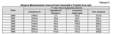 В результаті аналізу джерел фінансування технологічних інновацій в Україні видно, що частка державного бюджету в обсязі загальних асигнувань є найменшою (табл. 2) [11, с. 90].