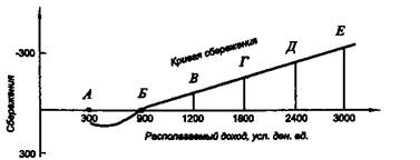 На оси абсцисс откладывается располагаемый или чистый доход. На оси ординат – расходы на потребление. Если бы расходы в точности соответствовали доходам, то это отражала бы любая точка, лежащая на прямой, проведенной под углом 45°. Но в действительности такого совпадения не происходит, и только часть доходов расходуется на потребление. Поэтому кривая потребления отклоняется от линии 45 вниз. Место пересечения линии 45° и кривой потребления в точке В означает уровень нулевого сбережения. Слева от этой точки можно наблюдать отрицательное сбережение (т.е. расходы превышают доходы – «жизнь в долг»), а справа – сбережение положительное. [5, с. 103]