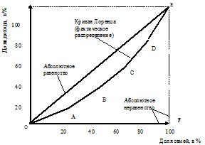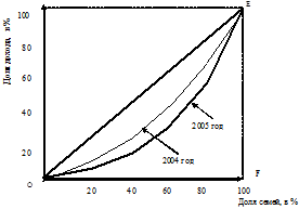 При построении кривой Лоренца по оси абсцисс откладываются доли семей (в % от их общего числа) с соответствующим процентом дохода, а по оси ординат – доли доходов рассматриваемых семей (в % от совокупного дохода). Теоретическая возможность абсолютного равного распределения дохода представлена биссектрисой. Область между линией абсолютного равного распределения и кривой Лоренца указывает на степень дифференциации доходов: чем больше эта область, тем больше неравенство доходов. В реальности фактическое распределение дохода показано линией OABCDE. Изменения кривой Лоренца в России в 2004 - 2005 годах (см. Приложение Рис.2 [9, с.291]) показывают, что неравенство доходов в России в 2005 г. увеличилось по сравнению с 2004 и натяжение "лука Лоренца" возросло. Что говорит об увеличении неравномерности распределения доходов в стране, а, следовательно, и о росте социальной напряженности.