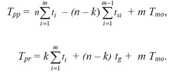 Tpp = n ∑ti - (n - k) ∑tsi + m Tmo = 10 * (8 + 7 + 5 + 3) - (10 - 2) (7 + 5 + +3) + 4 * 3 = 10 * 23 - 8 * 15 + 12 = 122 мин.