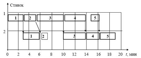 Рис. 7.2. Продолжительность цикла обработки деталей в оптимальной последовательности 5 - 1 - 3 - 4 - 2. Продолжительность цикла 16 мин.