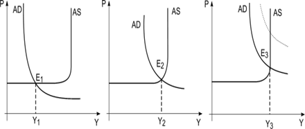 Кейнсианская экономическая теория оспаривает существование такого механизма саморегулирования. На основе эмпирических данных, полученных в период Великой Депрессии, Д. Кейнсу удалось доказать, что полная занятость в нерегулируемой экономике может возникнуть только случайно. Равновесие спроса и предложения, как правило, не совпадает с полной занятостью ресурсов: в точке А устанавливается равенство AD = AS, однако равновесный объем производства YQ