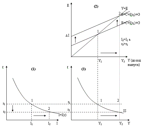 Как видно из графиков, уменьшение ставки процента с r1 до r2 (рис.1), увеличивает инвестиции с I1 до I2 (рис.1). Увеличение планируемых инвестиций сдвигает функцию планируемых расходов вверх, на величину I (рис.2). Это ведёт к более высокому уровню дохода (рис.2).