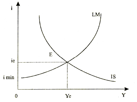 Конфигурация линии LM позволяет выделить на ней три участка: 1) участок, асимптотически приближающийся к i(min), практически параллельный оси абсцисс (кейнсианская область); 2) участок с положительным наклоном (промежуточная область) и 3) перпендикулярный к оси абсцисс участок, соответствующий i > i(max) (классическая область).