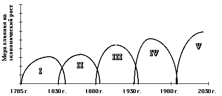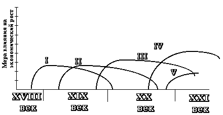 Рис. 2. Влияние сменяющихся технологических укладов на экономический рост в промышленно развитых странах. [18]