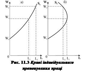 : коли переважає ефект заміни, крива індивідуального пропонування є висхідною (рис. 11.3.а), коли починає переважати ефект доходу, вона відхиляється ліворуч (рис. 11.3.б).