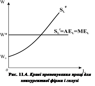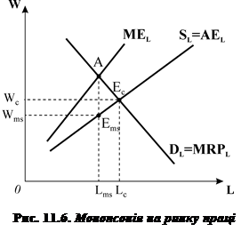 – єдина фірма-наймач робочої сили у регіоні (рис. 11.6). Монопсоніст стикається з кривою ринкового пропонування праці, яка відображає середні видатки наймача . Збільшення найму робітників для монопсоніста означає необхідність підвищення ставки заробітної плати не тільки для додаткового, але й для всіх попередньо найнятих робітників, внаслідок чого значення зростають швидше, ніж ,