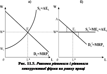 (рис. 11.5.б) за правилом оптимального використання ресурсу і максимізує прибуток за умови: . У стані рівноваги заробітна плата