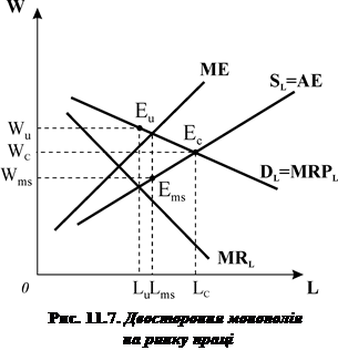 виникає, коли профспілка як продавець праці стикається з покупцем – монопсоністом (рис. 11.7). Монопсоніст приймає рішення згідно правила , профспілка – подібно до простої монополії на ринку товарів: кількість робітників відповідає точці перетину і , а ставка зарплати визначається за кривою попиту на працю. За інших рівних умов на такому ринку, порівняно з конкурентним, рівноважна кількість робітників буде меншою, а профспілкова ставка зарплати буде значно вищою за монопсонічну. Сторона, яка має більшу силу і ефективнішу стратегію, може добитись ставки, ближчої до тієї, яку запропонувала вона. Якщо сторони мають приблизно рівну економічну силу, результат буде проміжним, ставка зарплати наближатиметься до конкурентної, а рівень зайнятості збільшиться.