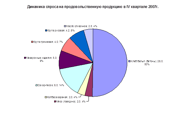 Повышенным спросом в данном магазине в IV квартале 2007 г. пользовались хлеб белый (батон) - 50.3%, сахар-песок – 14.4%, макаронные изделия – 9%. Вследствие чего, хлеб белый (батон) реализован в количестве 28 шт. на сумму 280,00 рублей, сахар-песок в количестве 8 кг. на сумму 688,00 рублей, макаронные изделия в количестве 5 кг. на сумму 300,00 рублей (график № 1).