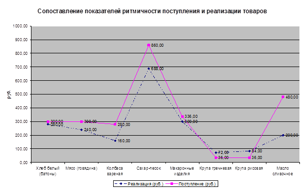 Однако рассматривая показатели коэффициента реализации, как в товаре хлеб белый (батон), так и в товарах: мясо (говядина), колбаса вареная, сахар-песок, макаронные изделия и масло сливочное он оставался низким, т.е. товаров завозилось больше, чем их было продано. При этом в товарах крупа гречневая и крупа рисовая показатель реализации вырос в 2 раза, т.е. было продано в два раза больше товаров, чем завозилось. Это, безусловно, сказалось на изменение величины товарных запасов, по отдельным видам товаров происходил их рост, а по другим – снижение (график № 2).