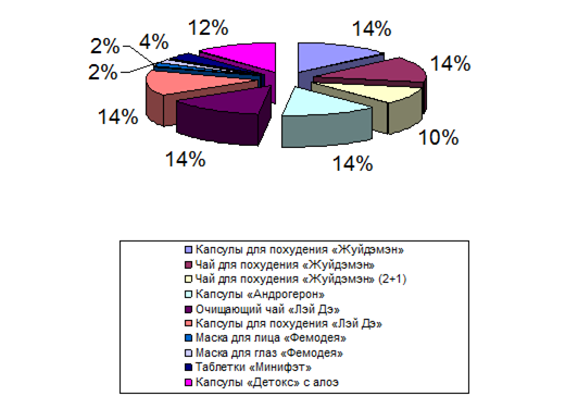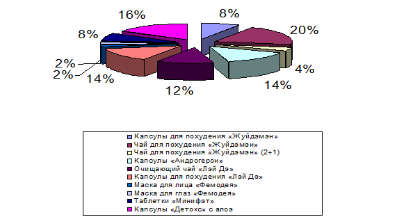 6. Предприятию удалось выполнить и перевыпонить план по продаже по таблеток «МиниФэт» - (+ 9,93%) и капсул ДЕТОКС с алоэ-САМИН – (+5,56%), выполнен план по товару Андрогерон Жуйдэмэн - (+ 0,37%), по остальным группам товаров план не выполнен. Разумеется, что кардинальный план изменения структуры продаж не мог оправдать себя за столь короткий срок без определенных мер, направленных на изменение структуры продаж. Такими мерами могли бы стать следующие: введение скидок на определенные группы товаров. При этом, чтобы не потерять часть прибыли можно было бы применить систему товар в нагрузку: при покупке товара пользующегося средним и малым спросом ввести систему «два по цене одного» или при заказе 5 единиц, 6 – бесплатно. Даже проведение одной такой разовой акции могло бы существенно изменить структуру продаж товара. Но руководство предприятия не захотело идти по данному пути. Результат традиционного пути был проанализирован выше.