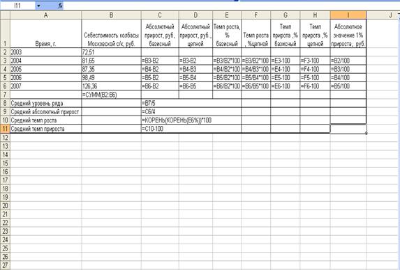 - величина себестоимости производства колбасы «Московская» за период с 1.01.03г. по 1.01.07г. в среднем увеличивалась на (114,90-100)% 14,90% в год.
