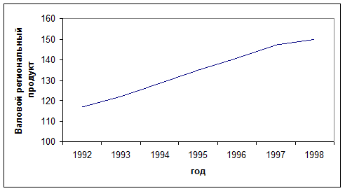 Таким образом, видим, что в 1992 – 1998г.г. тенденция валового регионального продукта характеризуется постоянным ростом. В целом за рассматриваемый период валовой региональный продукт увеличился на 33 или 28,2%. В среднем валовой региональный продукт в год увеличивался на 5,5 или на 4,2%.