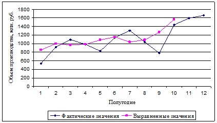 Данные таблицы свидетельствуют о том, что в целом, объёмы производства продукции имеют тенденцию к росту, хотя на протяжении 12 полугодий наблюдались как рост, так и спад уровня объемов производства. Наглядно это можно рассмотреть на рис. 2.