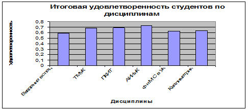 После проведения статистического анализа оценки удовлетворенности студентов преподаванием дисциплин выявили, что в среднем удовлетворенность дисциплинами составляет 66%. Наименьшую удовлетворенность следует отметить при преподавании дисциплины «Введение в специальность» – 59%, а наибольшую удовлетворенность при преподавании дисциплины «Автоматизация измерений, испытаний и контроля» – 73%.