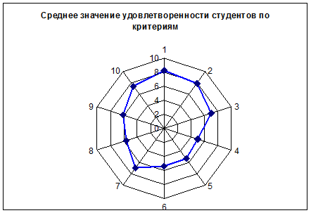 Для оценки удовлетворенности студентов были использованы столбчатый, круговой, линейный, радиационный и ленточный графики.