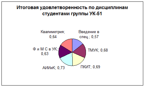 Анализ оценки удовлетворенности показал, что студенты группы УК-51 наиболее удовлетворены преподаванием дисциплины автоматизация измерений, испытаний и контроля (73%), а менее всего дисциплиной введение в специальность (57%).