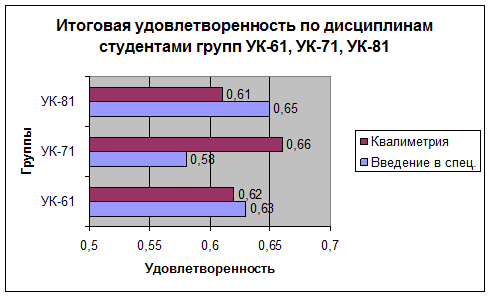 Проанализировав удовлетворенность студентов выявили, что в группах УК-61, УК-81 студенты наиболее удовлетворены преподаванием дисциплины введение в специальность (63% и 65% соответственно), а в группе УК-71 студенты наиболее удовлетворены преподаванием дисциплины квалиметрия (66%). Менее удовлетворены студенты групп УК-61, УК-81 преподаванием дисциплины квалиметрия, а студенты группы УК-71 преподаванием дисциплины введение в специальность.