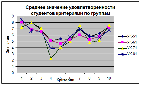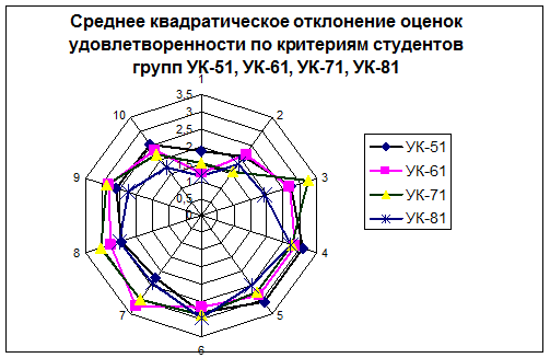 В таблице 10 представлены значения среднего квадратического отклонения оценок удовлетворенности по критериям студентов групп УК-51, УК-61, УК-71, УК-81. Графическое представление данных изображено на рисунке 7.