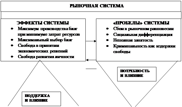 Рыночная организация хозяйства оказалось наиболее приспособленной для сочетания личных и общественных экономических интересов. Она способна функционировать лишь при наличии определённых условии, создаваемых государством. К ним относятся: