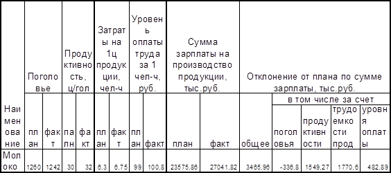 Произошел перерасход средств фонда оплаты труда на 3465,96 тыс.руб. На это оказало влияние изменение поголовья скота, продуктивности, трудоемкости и уровня оплаты труда. Заработная плата на 1 т молока возросла на 567 руб. за счет увеличения трудоемкости на 445,5 руб. и повышения оплаты за 1 чел – ч на 121,5 руб. Последняя увеличилась за счет повышения тарифных ставок в связи с инфляцией. Дополнительные затраты на содержание животных не окупились прибавкой продуктивности в результате фактические затраты труда выше плановых.