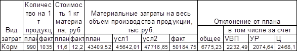 Материальные затраты зависят от количества израсходованных материальных ресурсов и цен на них. Из-за увеличения объема производства, материалоемкости и стоимости материальных ресурсов материальные затраты превысили плановые на 6775,23 тыс.руб. на весь объем производства. Большой удельный вес в материальных затратах занимают расходы на кормление животных. Сумма этих затрат зависит от эффективности использования кормов и их стоимости. Неэффективное использование кормов и увеличения в их составе более дорогих покупных комбикормов привело к перерасходу средств на 1 т молока на 1143 руб.