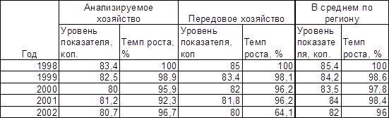 При одном и том же уровне и темпах роста цен на промышленную продукцию величина себестоимости продукции в разных хозяйствах не одинакова. Это обусловлено разным уровнем продуктивности животных и урожайности культур.