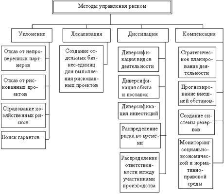 Управление риском - это процесс подготовки и реализации мероприятий, имеющих целью снизить опасность ошибочного решения и уменьшить возможные негативные последствия нежелательного развития событий в ходе реализации принятых решений. В реальных хозяйственных ситуациях могут использоваться различные способы снижения финального уровня риска, воздействующего на те или иные стороны деятельности предприятия. Все многообразие применяемых в хозяйственной практике промышленных предприятий методов управления риском можно разделить на четыре типа (рис.2).